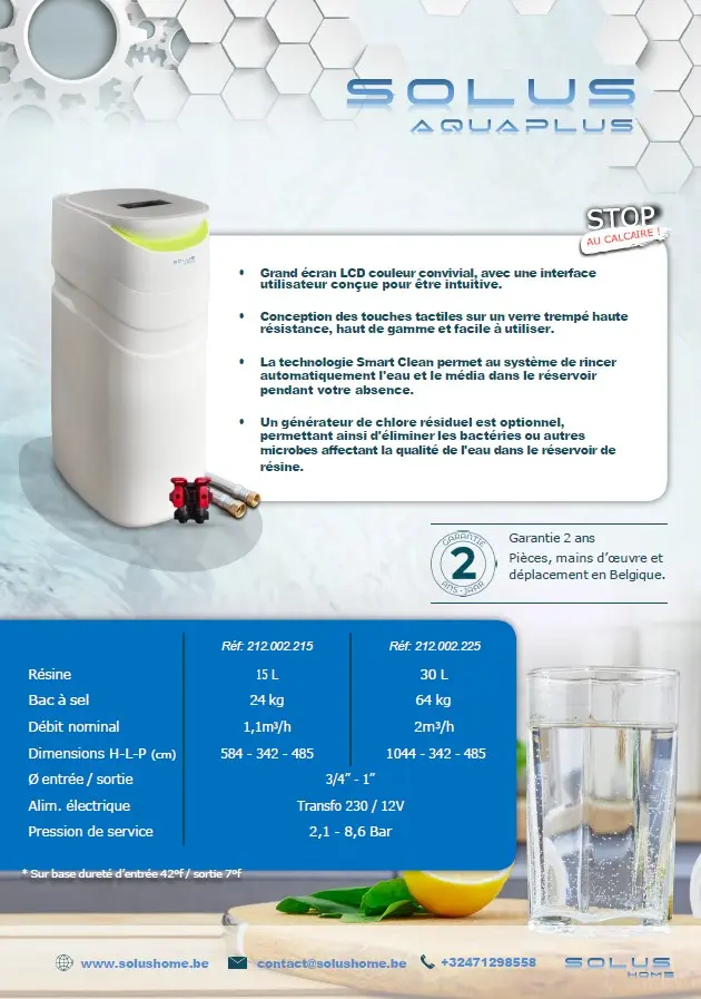 L'adoucisseur d'eau réduit l'accumulation de calcaire sur les robinets, les douches et les appareils électroménagers, ce qui diminue le temps et les efforts nécessaires pour le nettoyage. Moins de calcaire signifie également l'utilisation de moins de produits de nettoyage.